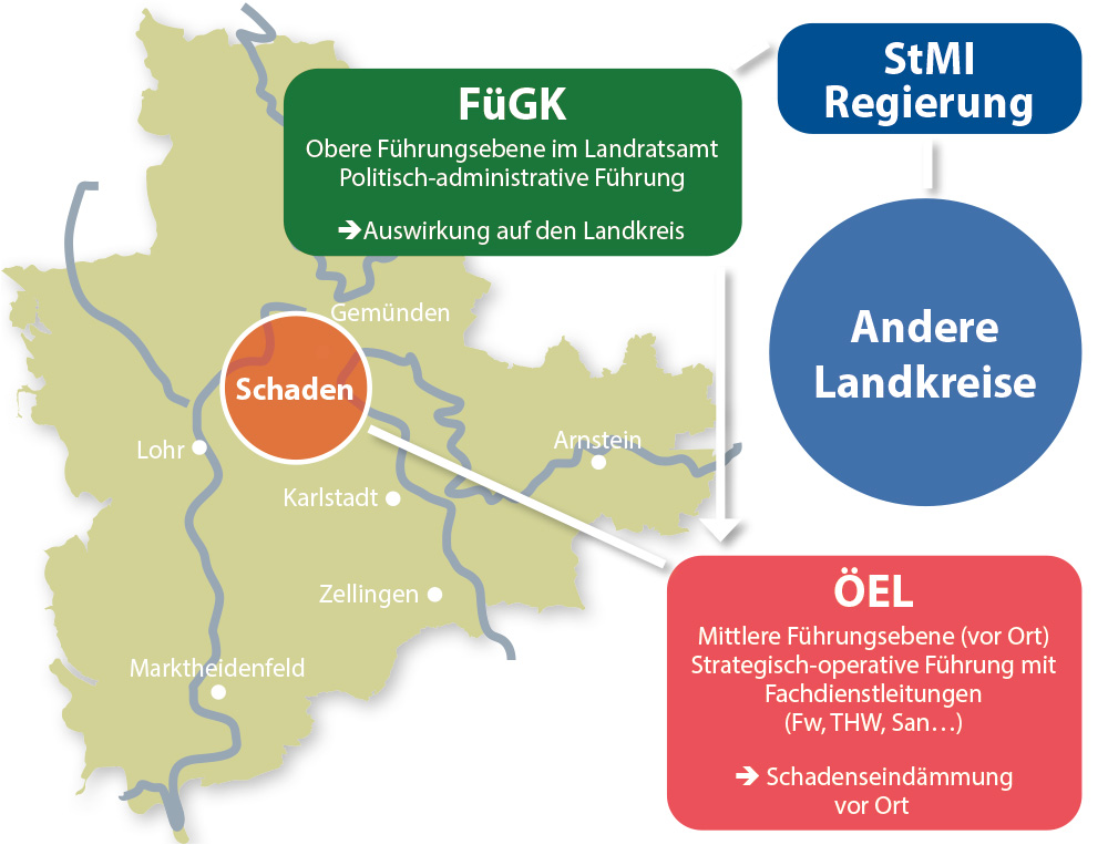 „Die Aufgabe der Einsatzkräfte ist es, vor Ort den Schaden zu bewältigen. Wir prüfen als übergeordneter Verwaltungsstab parallel, welche weiteren Auswirkungen die Katastrophe auf den Landkreis haben könnte, um negative Folgen für die Bevölkerung zu verhindern oder zumindest einzudämmen. So konnten auch alle Passagiere der ‚Amadeus Elegant‘ wohlbehalten die Heimreise antreten. Für die Krisenbewältigung sind wir auch mit der Regierung von Unterfranken in Kontakt, um bei Bedarf weitere Hilfsressourcen zu erhalten“, so Ratka. „Gerade bei langen und kräfteintensiven Einsätzen greift das Hilfeleistungssystem in Bayern. Hier unterstützen die Landkreise sich gegenseitig in den betroffenen Gebieten“, erklärt Huth. „Über die Regierungen haben wir Anfang Juni 2024 Anfragen bekommen, ob wir in einem sogenannten Hilfeleistungskontingent mit Einheiten unterstützen können, als verheerende Hochwasser weite Teile Bayerns heimsuchten und insgesamt 18 Landkreise oder Städte den Katastrophenfall festgestellt haben“, erinnert sich Ratka. So halfen zahlreiche Einsatzkräfte aus Main-Spessart in den betroffenen Regionen.