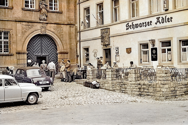 Blick auf das Gebäudeensemble am Marktplatz in Karlstadt im Jahre 1960. Hier hat heute das Landratsamt seinen Sitz.