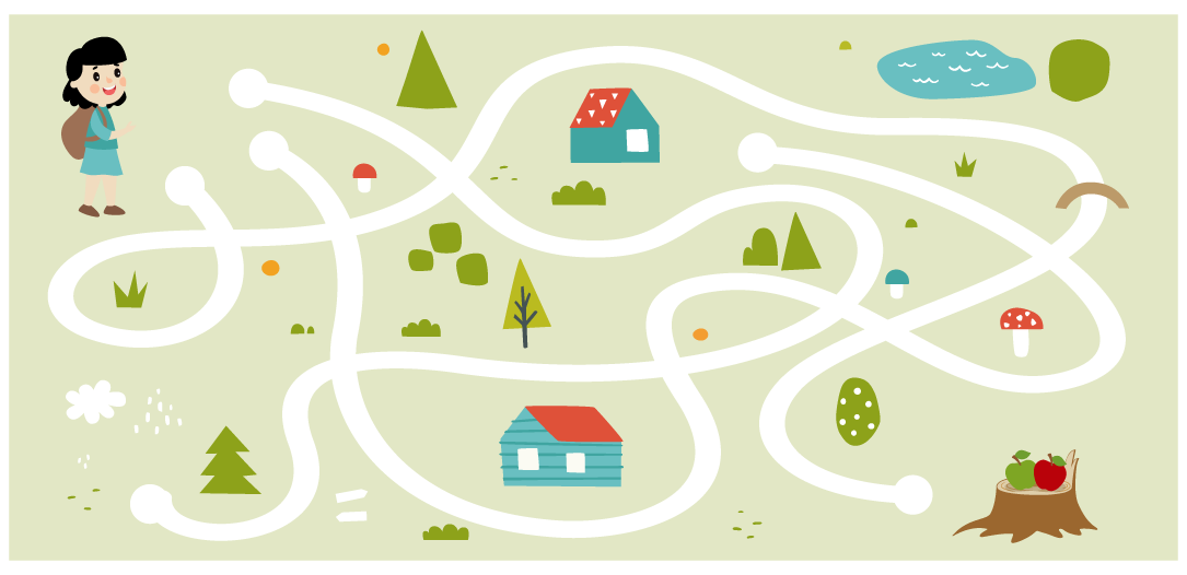 Oh nein! Alex hat beim Wandern auf dem Räuberpfad ihre Äpfel auf einem Baumstumpf vergessen. Kannst du ihr helfen, den Weg zu ihrem Proviant zurückzufinden?